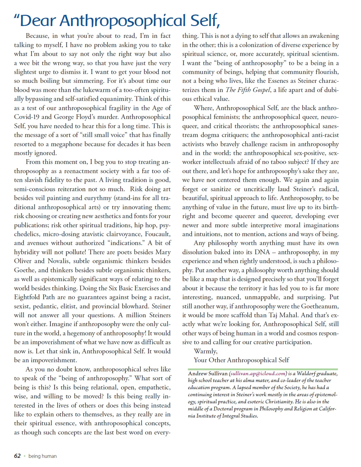 Below is a letter written by Andrew Sullivan, a Waldorf teacher and anthroposophist that was originally published in Being Human. We appreciate the spirit of renewal he is inviting into the Great Work of all those called to participate with Anthroposophia.